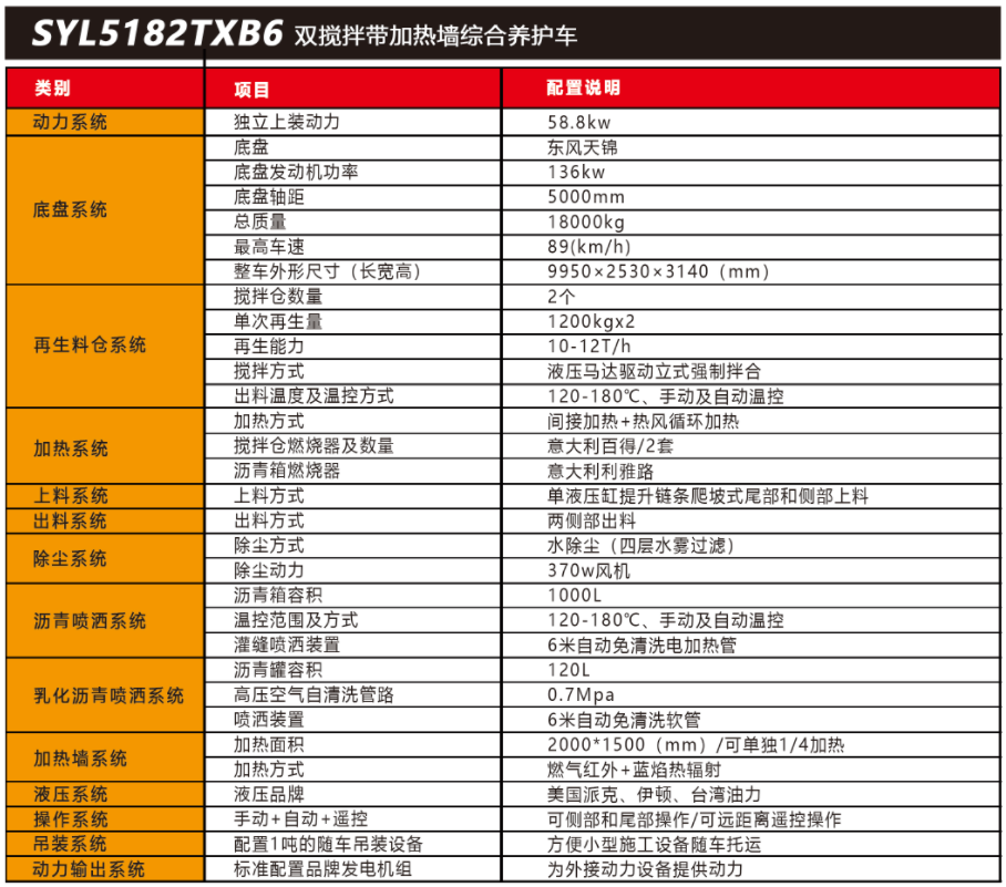 SYL5182TXB6 双搅拌带加热墙路面综合养护车是一款集现场生产新沥青混合料、沥 青路面冷料、 旧料、铣刨料 100%现场加热再生利用 ,热沥青洒布、裂纹跟踪灌缝、乳化 沥青喷洒、为其他装置提供电力和液压动力等多种功能于一体的沥青路面热再生综合养护 车。配置智能燃气红外线加热墙 ,可轻松对路面进行全方位加热 ,可实现多场合、多路面 的各种类养护作业。养护修补费用低 ,作业快捷 ,高效率、节能环保性能突出等特点。主要适用于多种路况的中大施工量和高速公路的修补施工。