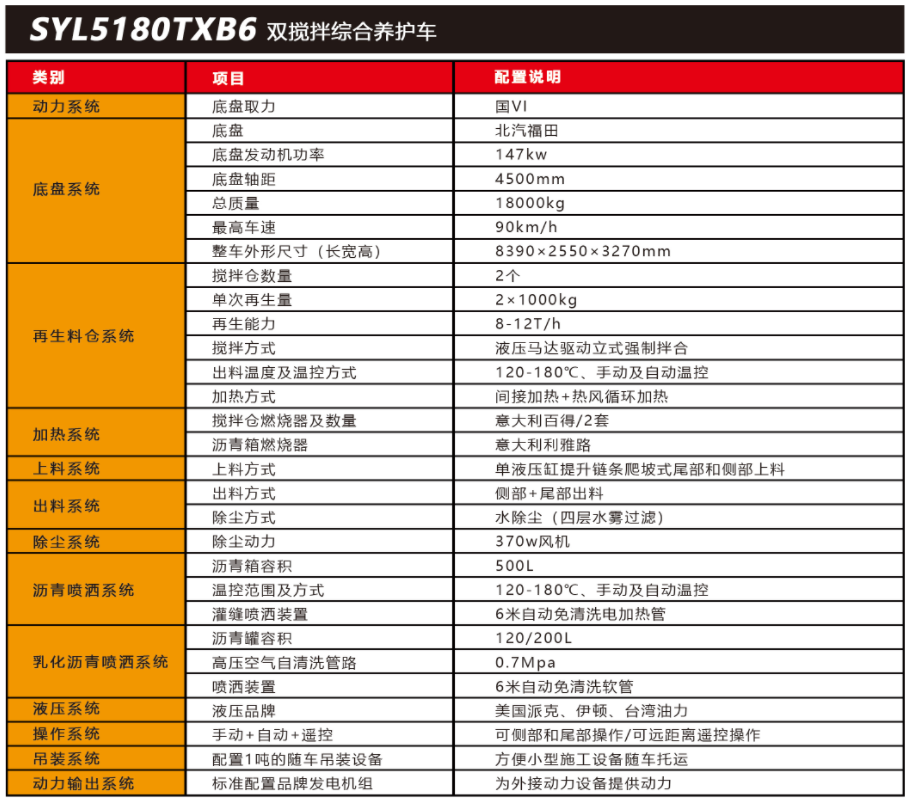 SYL5180TXB6 双搅拌路面综合养护车是一款集现场生产新沥青混合料、沥青路面冷 料、旧料、铣刨料 100%现场加热再生利用,热沥青洒布、裂纹跟踪灌缝、乳化沥青喷洒、 为其他装置提供电力和液压动力等多种功能于一体的沥青路面热再生综合养护车。可实现 多场合、多路面的各种类养护作业 ,养护修补费用低 ,作业快捷 ,高效率、节能环保性能突出等特点。适用于多种路况的中大施工量和高速公路的修补施工。