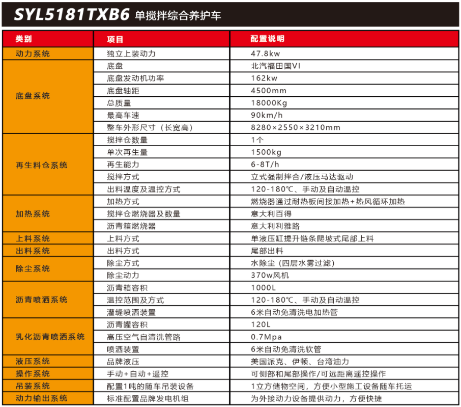 SYL5181TXB6 单搅拌综合养护车是一款集现场生产新沥青混合料、沥青路面冷料、 旧料、铣刨料100%现场加热再生利用 ,热沥青洒布、裂纹跟踪灌缝、乳化沥青喷洒、为其他装置提供电力和液压动力等多种功能于一体的沥青路面热再生综合养护车。可实现多场合、多路面的各种类养护作业 ,养护修补费用低 ,作业快捷 ,高效率、节能环保性能突出等特点。适用于远郊较宽阔区域中大施工量和高速公路的修补施工。