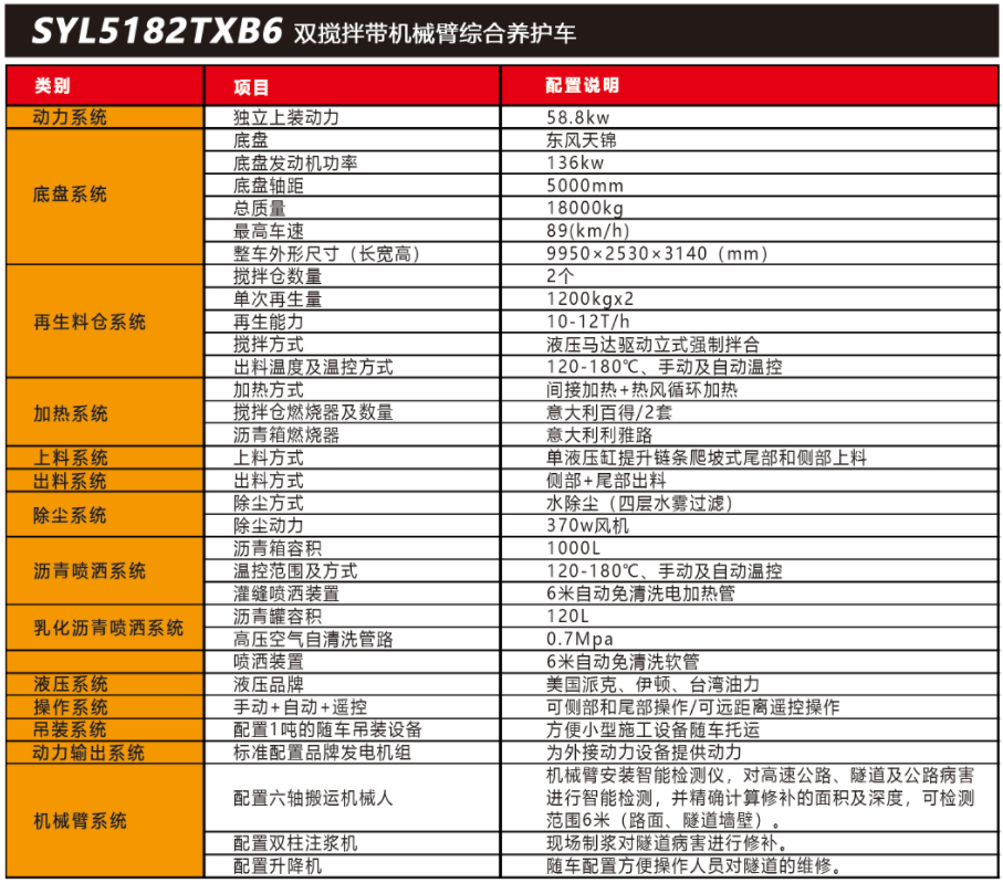 SYL5182TXB6 双搅拌带机械臂路面综合养护车是一款集现场生产新沥青混合料、沥青路面冷料、旧料、铣刨料 100%现场加热再生利用 ,热沥青洒布、裂纹跟踪灌缝、乳化 沥青喷洒、为其他装置提供电力和液压动力等多种功能于一体的沥青路面热再生综合养护车。配置智能隧道检测设备 ,一车多能 ,完成对公路、隧道病害 (坑槽、裂纹等) 进行智能检测和快速修补。可实现多场合、多路面的各种类养护作业。养护修补费用低 ,作业快捷 ,高效率、节能环保性能突出等特点。适用于多种路况的中大施工量和高速公路中的隧道的检测和修补施工。
