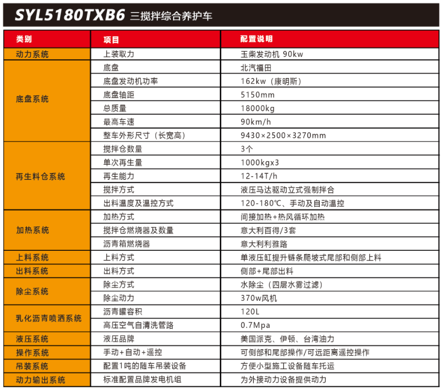 SYL5180TXB6 三搅拌路面综合养护车是一款集现场生产新沥青混合料、沥青路面冷 料、旧料、铣刨料 100%现场加热再生利用,热沥青洒布、裂纹跟踪灌缝、乳化沥青喷洒、 为其他装置提供电力和液压动力等多种功能于一体的沥青路面热再生综合养护车。可实现多场合、多路面的各种类养护作业。养护修补费用低 ,作业快捷 ,高效率、节能环保性能